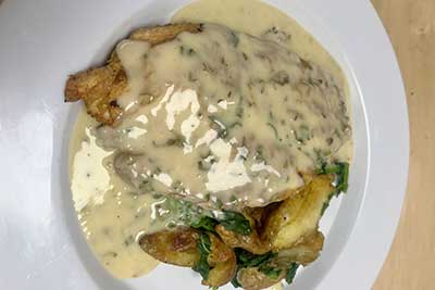 Chicken Francese with Smashed Potatoes and Broccoli Rabe
