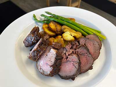 Colorado Lamb Leg, Rubbed with Garlic, Rosemary, Seared Rare, and Chilled to be Finished on Easter. Dinner Includes Roasted Potatoes, Asparagus, Lamb Jus, and Mint-Almond-Pecorino Pesto